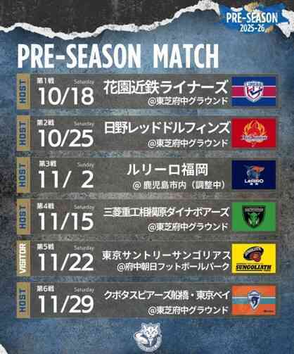 ■第1戦 10/18(土) 13:00 K.O. vs花園近鉄ライナーズ @東芝府中グラウンド ■第2戦 10/25(土) 12:30 K.O. vs日野レッドドルフィンズ @東芝府中グラウンド ■第3戦 11/2(日) 13:00 K.O. vs ルリーロ福岡 🆕@ 鹿児島市内(調整中) ■第4戦 11/15(土) 14:00 K.O. vs三菱重工相模原ダイナボアーズ @ 東芝府中グラウンド □第5戦 11/22(土) 13:00 K.O. vs 東京サントリーサンゴリアス @ 府中朝日フットボールパーク ■第6戦 11/29(土) 14:00 K.O. vsクボタスピアーズ船橋・東京ベイ @東芝府中グラウンド ⚠️観戦情報・調整中の試合詳細につきましては、決定次第、随時更新していきます