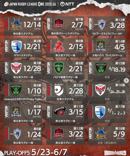 ★ ホストゲーム ☆ ビジターゲーム <2025> ★R1 12/14(日) vs 埼玉パナソニックワイルドナイツ @ 味スタ ☆R2 12/21 (日) vs 静岡ブルーレヴズ @ ヤマハ ☆R3 12/28(日) vs 横浜キヤノンイーグルス @ 秩父宮 <2026> ★R4 1/10(土) vs 三菱重工相模原ダイナボアーズ @ U等々力(川崎) ☆R5 1/17(土) vs 浦安D-Rocks @ 秩父宮 ★R6 1/24(土) vs クボタスピアーズ船橋・東京ベイ @ 秩父宮 ☆R7 2/7(土) vs 三重ホンダヒート @ 栃木グリスタ ★R8 2/15(日) vs コベルコ神戸スティーラーズ @ 秩父宮 ☆R9 2/21(土) vs トヨタヴェルブリッツ @ パロマ瑞穂(愛知) ★R10 2/28(土) vs リコーブラックラムズ東京 @ 白波(鹿児島) ☆R11 3/15(日) vs 東京サントリーサンゴリアス @ 秩父宮 ★R12 3/22(日) vs 三重ホンダヒート @ 秩父宮 ☆R13 3/28(土) vs クボタスピアーズ船橋・東京ベイ @ えどりく ★R14 4/5(日) vs 浦安D-Rocks @ 大和プレド(札幌) ☆R15 4/18or19 vs 三菱重工相模原ダイナボアーズ @ (未定) ★R16 4/24or25or26 vs 横浜キヤノンイーグルス @ (未定) ★R17 5/1or2or3 vs 静岡ブルーレヴズ @ (未定) ☆R18 5/9(土) vs 埼玉パナソニックワイルドナイツ @ (埼玉県内) 🏆PLAY-OFFS🏆 2026/5/23(土)〜6/7(日) ホストゲームではご来場の皆様さまにお楽しみいただけるイベントを企画中!❤️🔥 ⚠️調整中の試合詳細につきましては、決定次第、随時更新いたします🐺