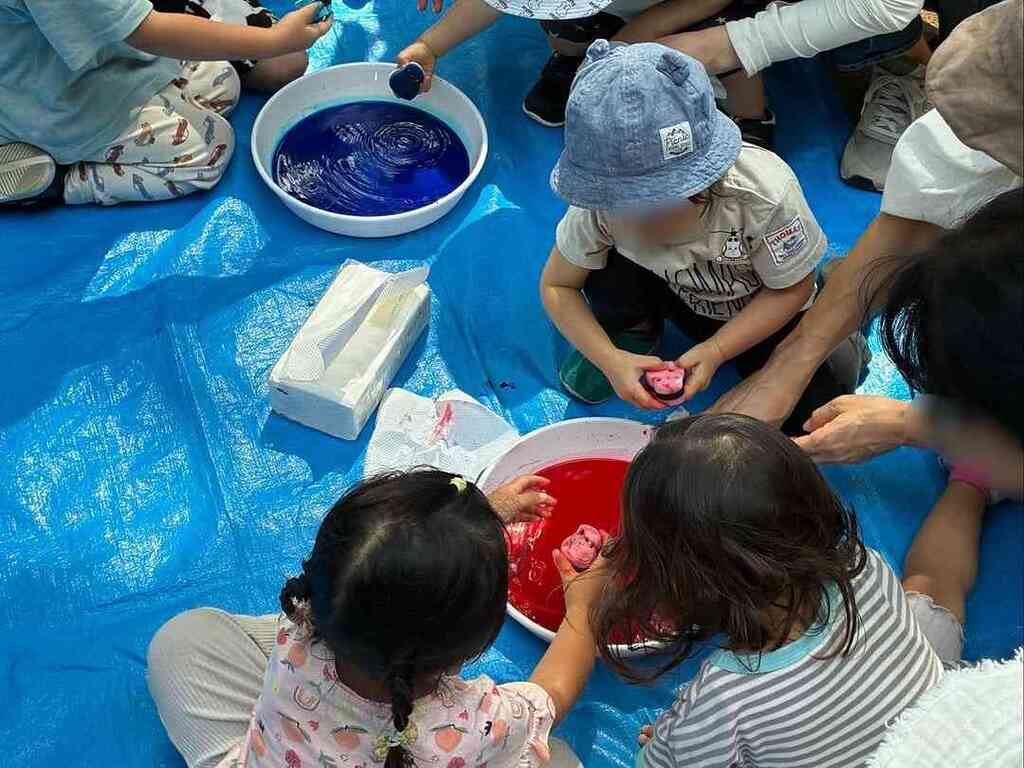 今回はスポンジを使って色水遊びをしたり、しゃぼん玉遊びをしました!
