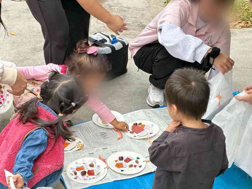 府中の森公園等で拾ったどんぐりと、折り紙で折ったどんぐりを使ってどんぐりの飾り物を作りました!作るときにどんぐりの形やコロコロ転がる音を楽しむ姿も見られました♪