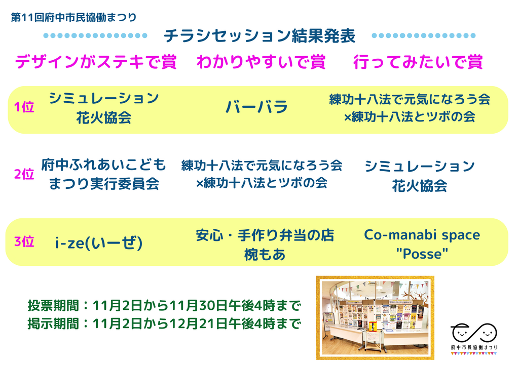 出展団体が市民協働まつり当日の企画や日頃の活動をチラシで紹介しています。 「デザインがステキ!」「わかりやすい!」「行ってみたい、参加したい!」 それぞれ、あなたが一番いいと思うチラシに投票してください。 あなたの1票が団体への応援になります。 チラシはル・シーニュ5階、府中市市民活動センタープラッツにて掲示しています。 お近くへお越しの際は是非お立ち寄りください。 チラシ掲示期間:11月2日から12月21日午後4時 投票期間:11月2日から11月30日午後4時 結果発表:12月8日(月)予定