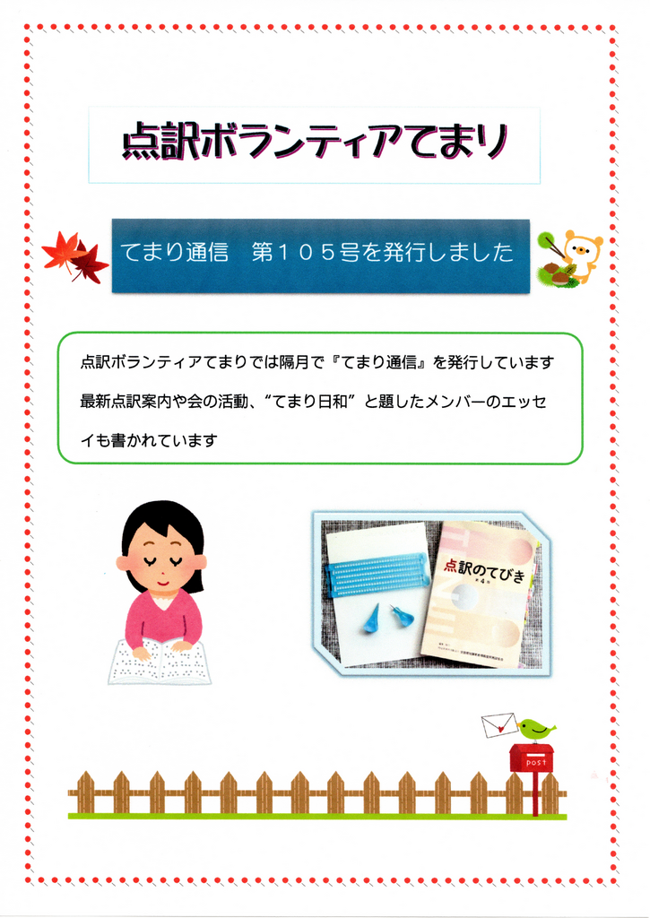 「点訳ボランティアてまり」が隔月で発行しているお便りです。最新点訳活動や「てまり日和」と題して、てまりメンバーの近況も伝えています。