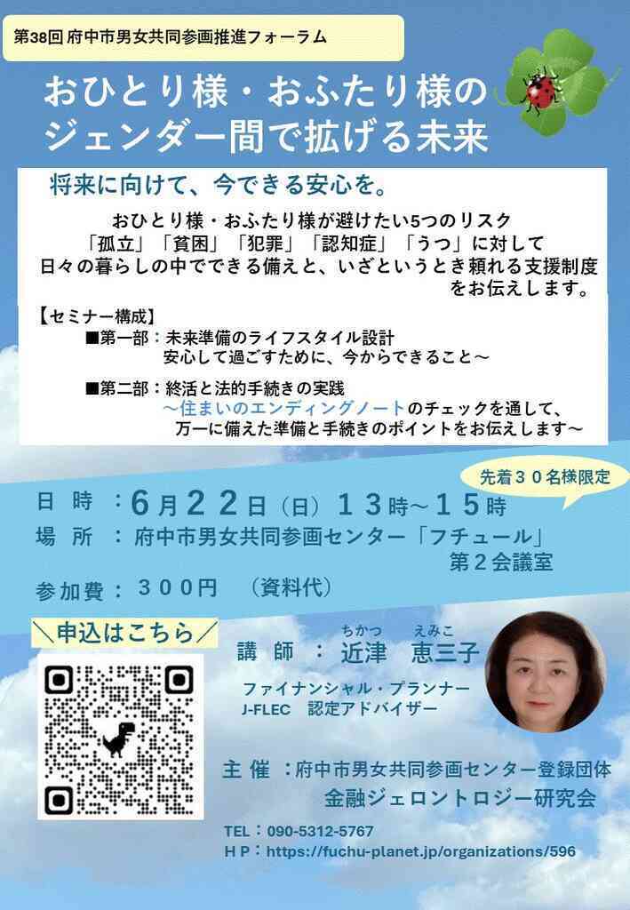 38回府中市男女共同参画推進フォーラム 日 時:2025年6月22日(日)13:00~15:00 テーマ: 「 おひとり様 おふたり様のジェンダー間で拡げる未来」 第38回府中市男女共同参画推進フォーラムにおいて、将来に向けて「今できる安心」を整えることをテーマに講演を行いました。 講演では、人生100年時代を見据えた未来準備としてのライフプラン設計や終活について、おひとり様・おふたり様それぞれの立場やジェンダーの視点を踏まえながら解説しました。老後の暮らしや意思決定に備えるため、早い段階から自分自身の考えを整理しておくことの重要性をお伝えしました。 また、近年注目されている「住まいのエンディングノート」を取り上げ、具体的なチェック項目を通じて、万一に備えて準備しておきたいポイントや必要な手続きについて紹介しました。住まいに関する情報を事前に整理しておくことで、本人の意思を尊重した選択が可能となり、周囲の負担軽減につながることを共有しました。 本講演を通じて、多様な生き方を尊重しながら、一人ひとりが主体的に将来を考え、安心につなげていくことの大切さを改めて考える機会となりました。