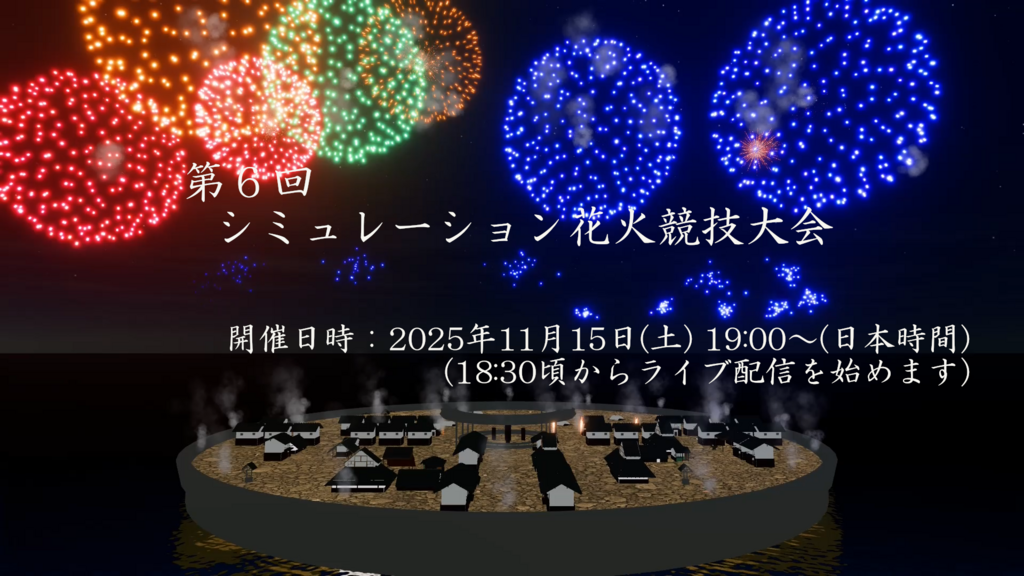3次元CGで作られた花火動画の競技大会です。 主な使用ソフトはFWsim。 応募数は15作品。そのほかオープニング花火、特別プログラム、第6回大会記念花火など、約1時間30分の豪華な祭典です。