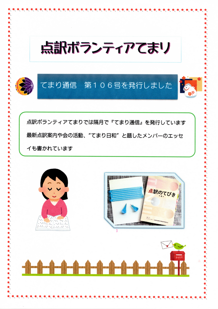 「点訳ボランティアてまり」が隔月で発行しているお便りです。最新点訳活動や「てまり日和」と題して、てまりメンバーの近況も伝えています。