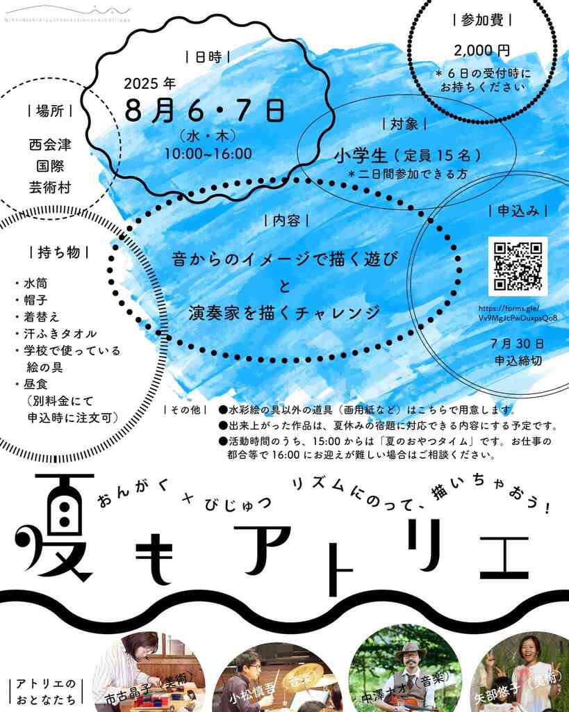 2025年8月、古今樂明座は西会津国際芸術村「夏もアトリエ」に参加。音から得たイメージで絵を描く体験やアーティスト支援を通し、自然の中で貴重な学びを得ました。