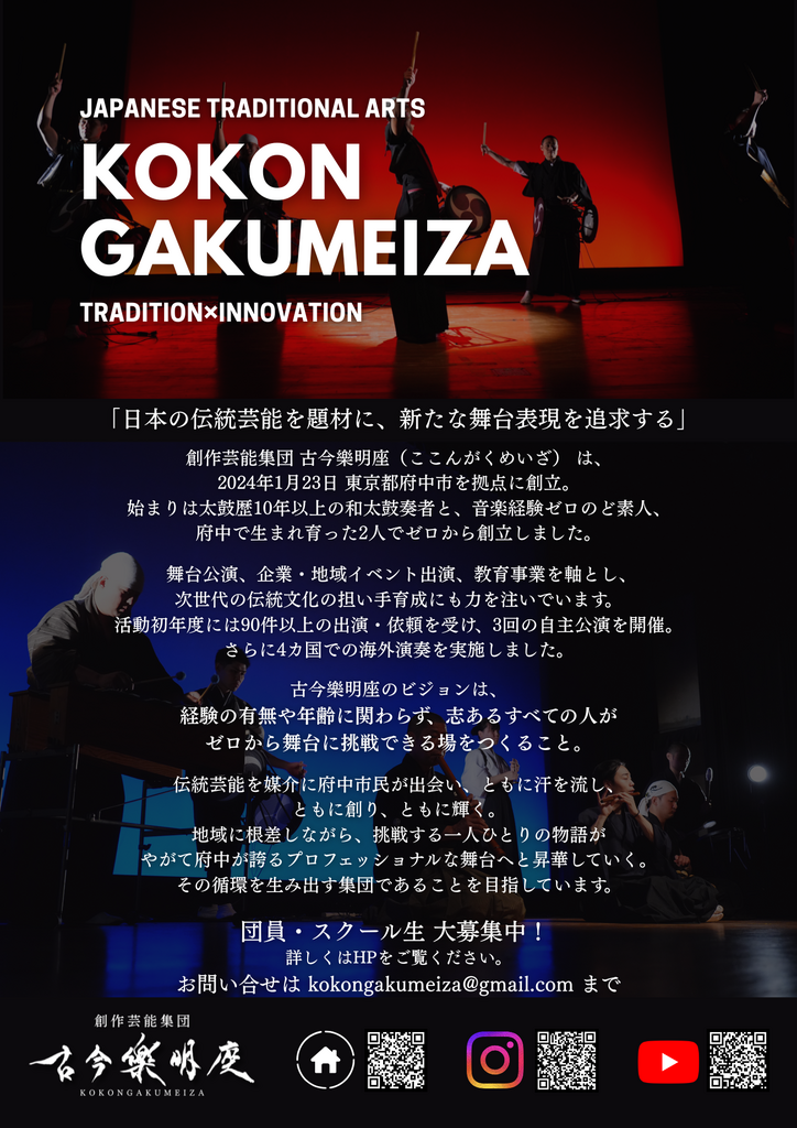 本公演は、「神隠し」をテーマに、日本の伝統芸能が織りなす幻想的な舞台作品です。和太鼓、薩摩琵琶、長唄三味線、日本舞踊といった多彩な表現が融合し、静けさと躍動が交錯する独自の世界観を描き出します。