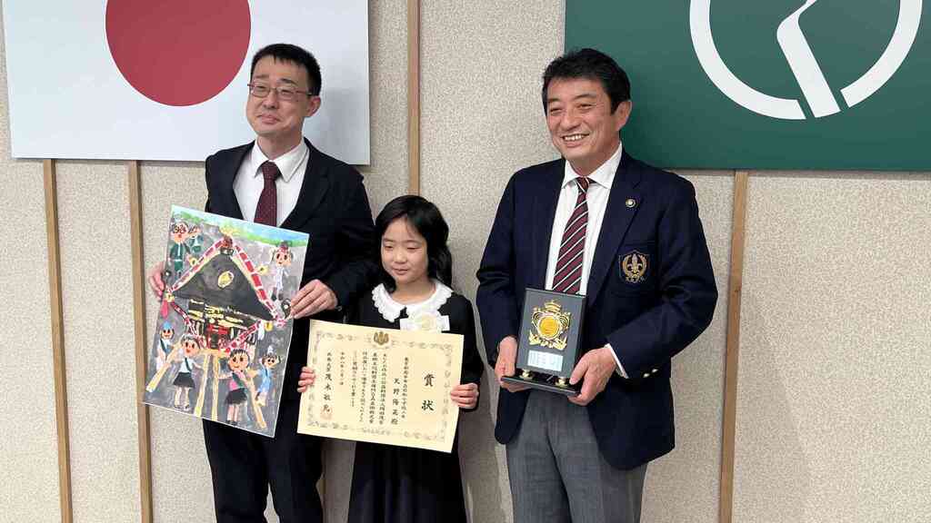 外務大臣賞を受賞された天野さんが高野市長に表敬訪問をされました。天野さんは市長さんに絵を描く際の工夫やお神輿を担いだ時の気持ちなど話され、和やかなムードで会話が進みました。