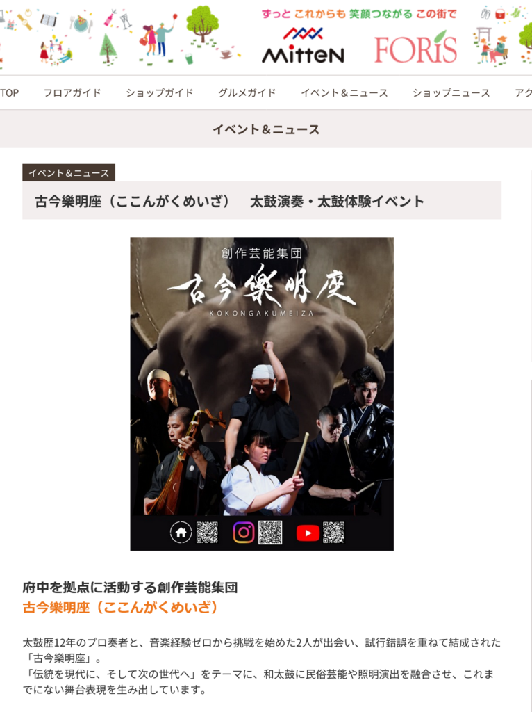 府中発の創作芸能集団「古今樂明座」による迫力満点の和太鼓演奏と、どなたでも参加できる太鼓体験イベントをミッテン府中にて開催!屋外ステージで気軽に楽しめる、臨場感あふれるひとときをお届けします。