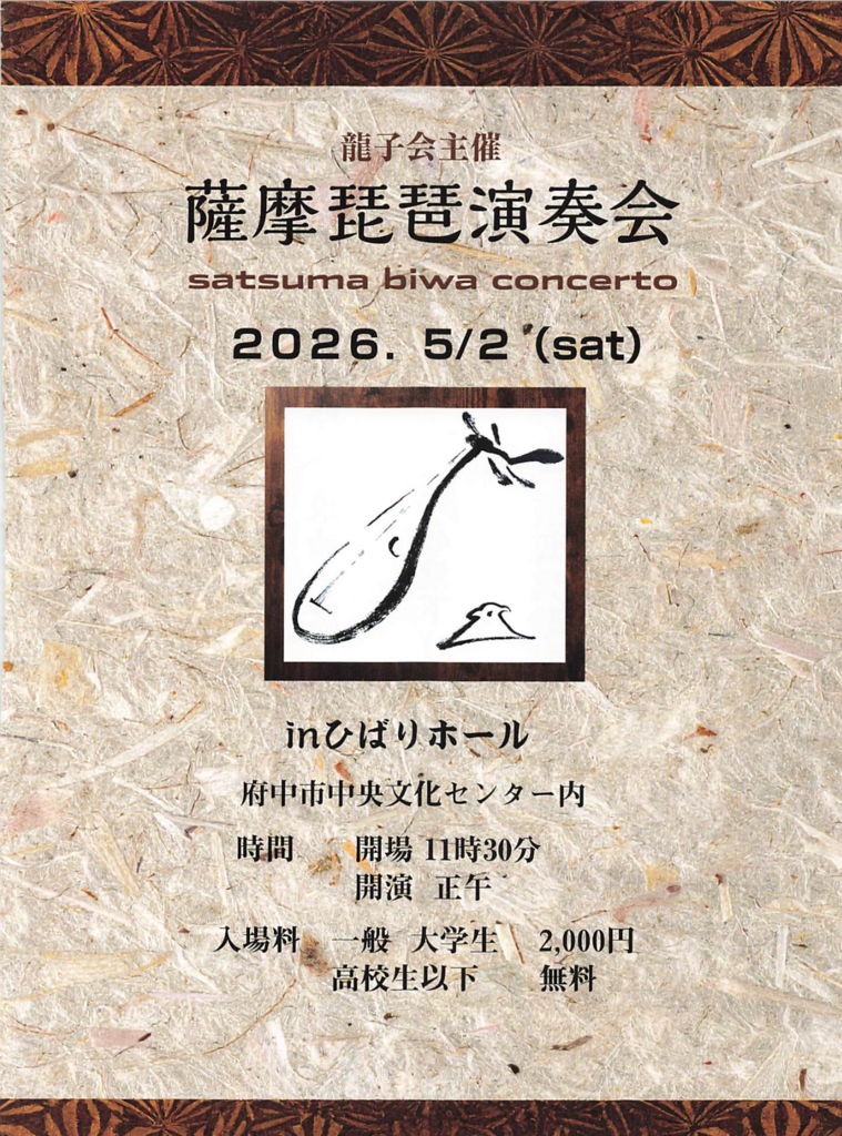 本公演は、「龍子会主催 薩摩琵琶演奏会」として、2026年5月2日(土)に府中市中央文化センターひばりホールにて行われます。開場は11時30分、開演は12時。入場料は2,000円で、高校生以下は無料となっており、幅広い世代の方に気軽にご来場いただけます。