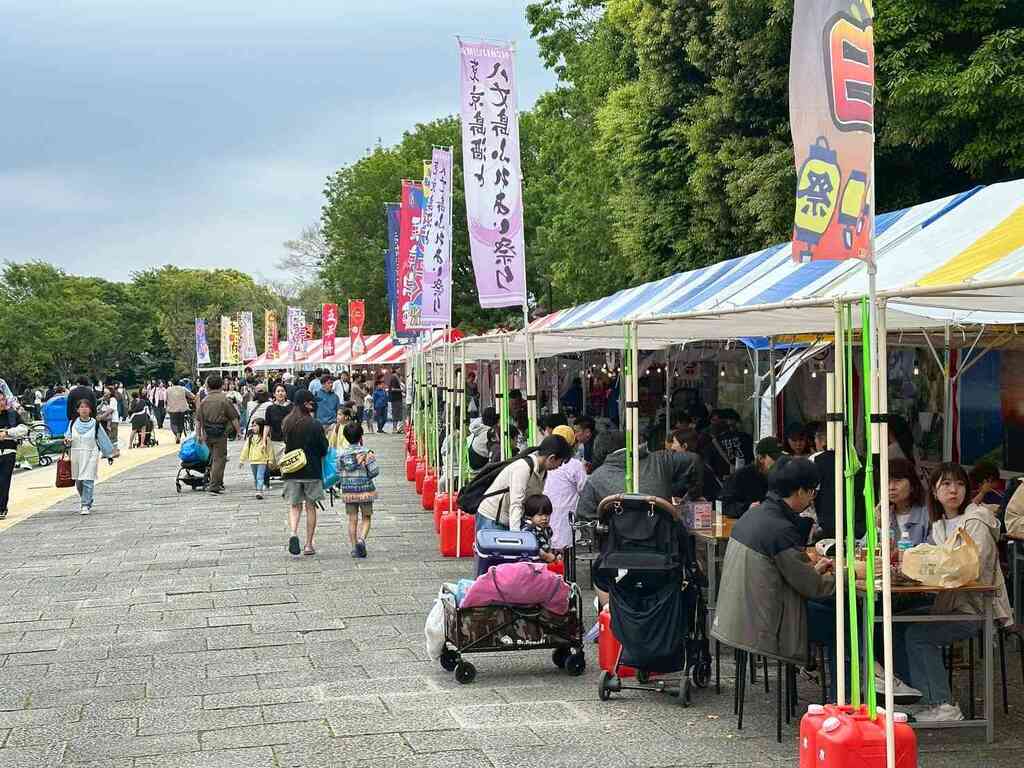 このお祭りは、八丈島の特産品の販売や島の魅力を伝える催しが行われる、地域のにぎわいあふれるイベントです。定期的に開催され、多くの来場者で賑わう中、「八丈太鼓はなみずき」さんによる迫力ある八丈太鼓の演奏も大きな見どころのひとつとなっています。