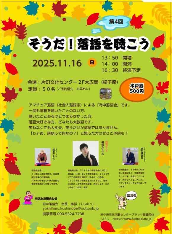 第四回府中落語会を片町文化センター 2階の大広間で開催します。アマ三人とプロ一人の四席(よっつ)で木戸銭500円❢こりゃお得です。お誘い合せのうえ。ぜひ、お運びくださいませ‼