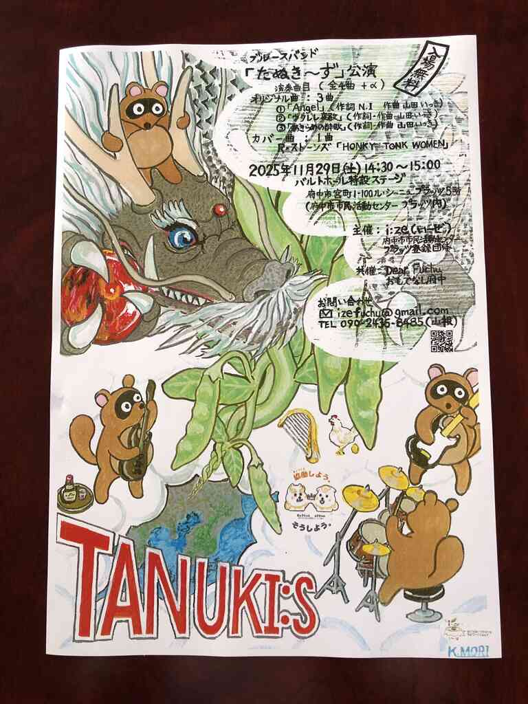 "たぬきーず"バンド演奏で会場を巻き込みます。4曲演奏予定です。①エンジェル②ウクレレ哀歌③ホンキートンクウーマン④あきらめ酔歌(③以外、自作のオリジナル曲です)