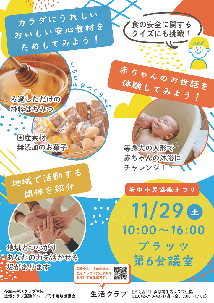 組合員の要望をもとに作られてきた生活クラブの食材の安全性・品質をアピールする展示と個包装のお菓子などの試食、椀もあやぽぽなど組合員活動のなかから生まれた事業・ワーカーズコレクティブなどの紹介を共同でします。