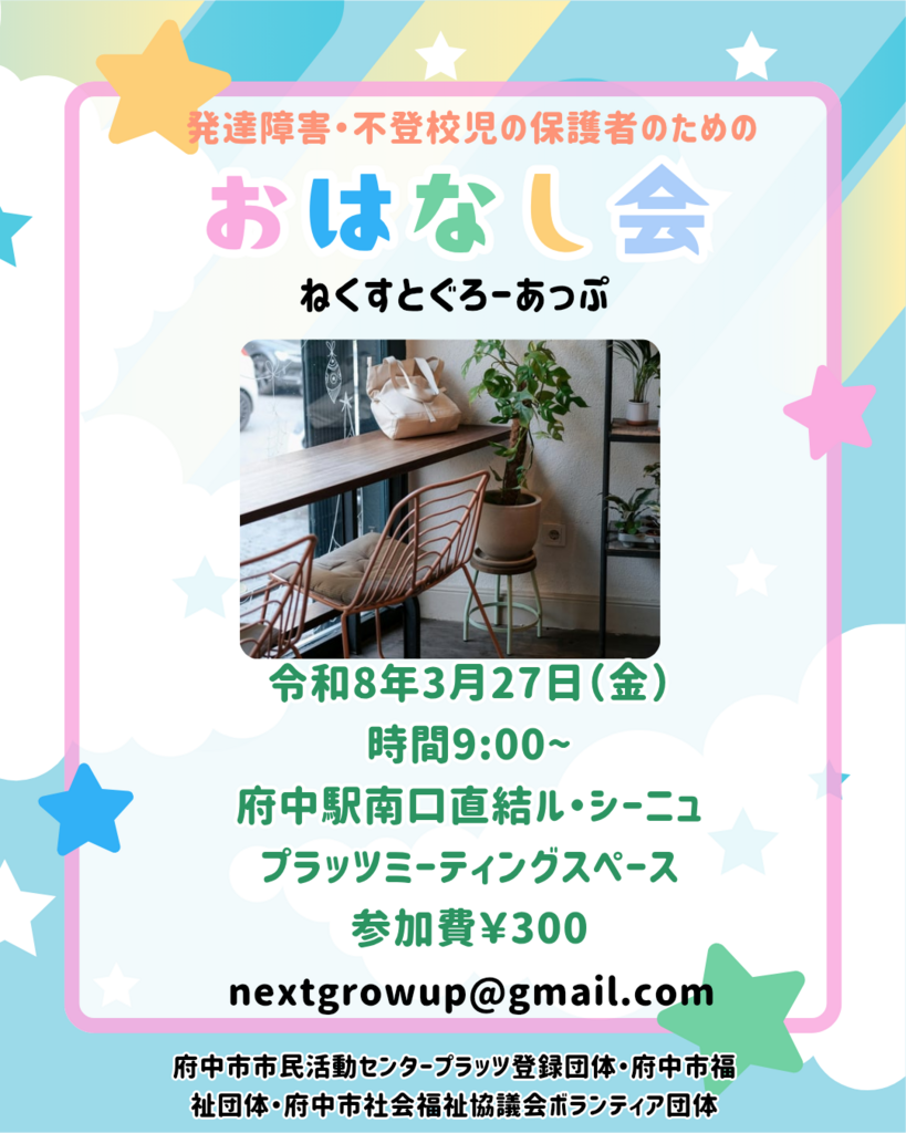 対象は、不登校、サポートルームを利用している、神経発達症と診断されていたり、生活に困りごとのあるお子さんの保護者です。診断・未診断は問いません。おはなし会は月1回不定期で、各回¥300となっております。