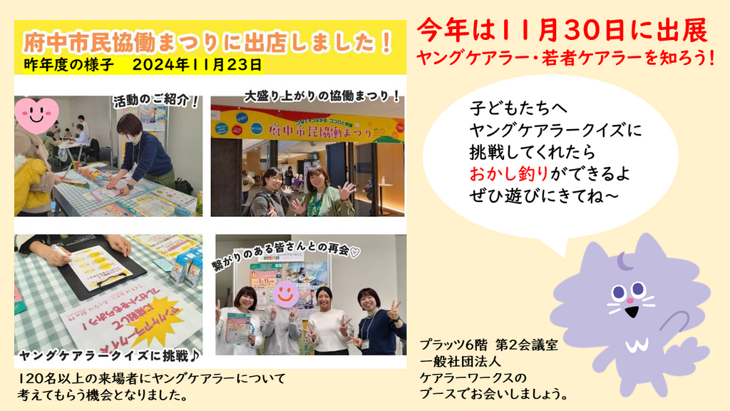「ヤングケアラー・若者ケアラーを知ろう!」をテーマに、今年もヤングケアラーや若者ケアラーについて知る、学ぶ、分かちあう機会になればと思っています。クイズもやります。