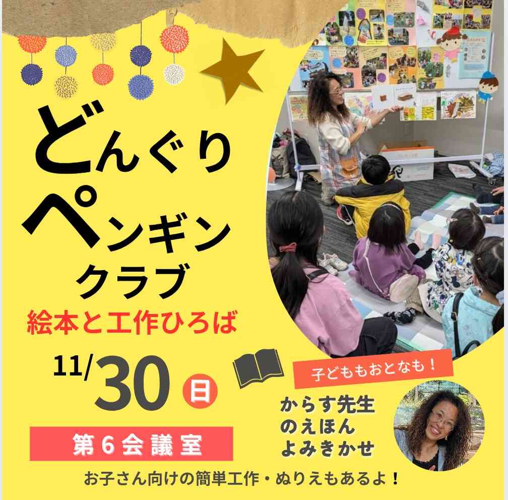 今年も開催!からす先生の絵本の読み聞かせ♪子どもも大人も、楽しい絵本の世界を堪能してください♪お子さん向けの工作やぬりえもあるよ。第6会議室でお待ちしています♪