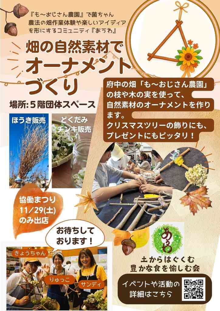 白糸台にある『も~おじさん農園』の枝や木の実を使って、自然素材のオーナメントを作ります。クリスマスツリーの飾りにもプレゼントにもピッタリです!